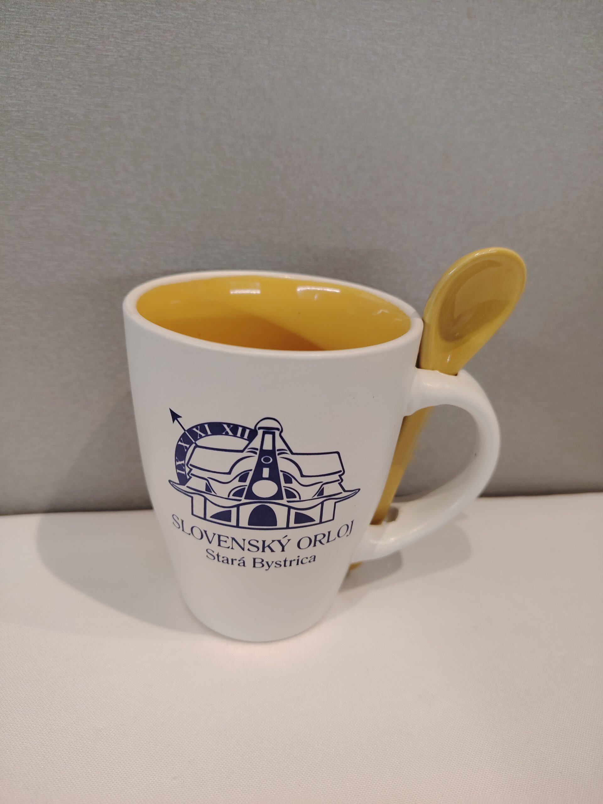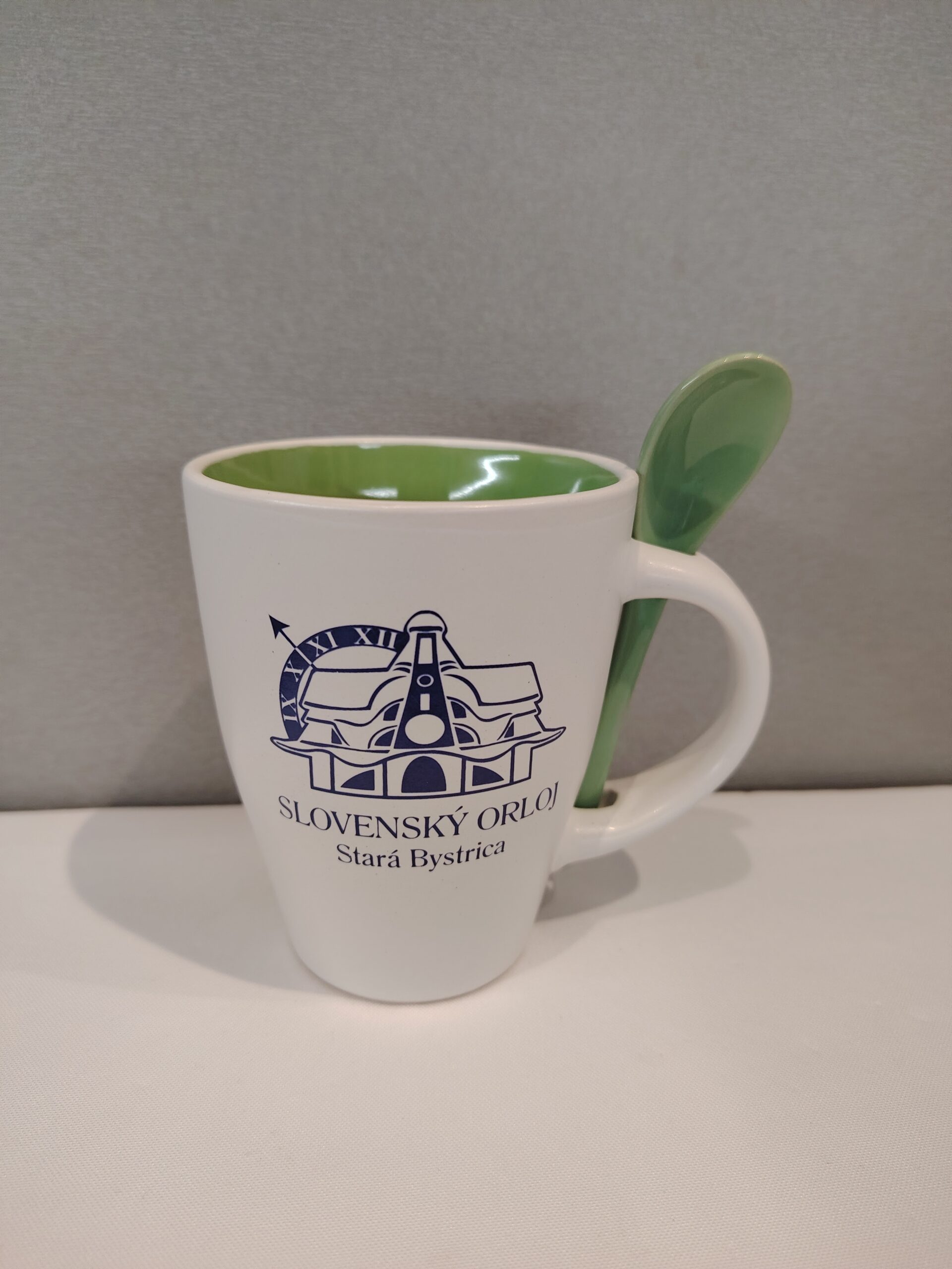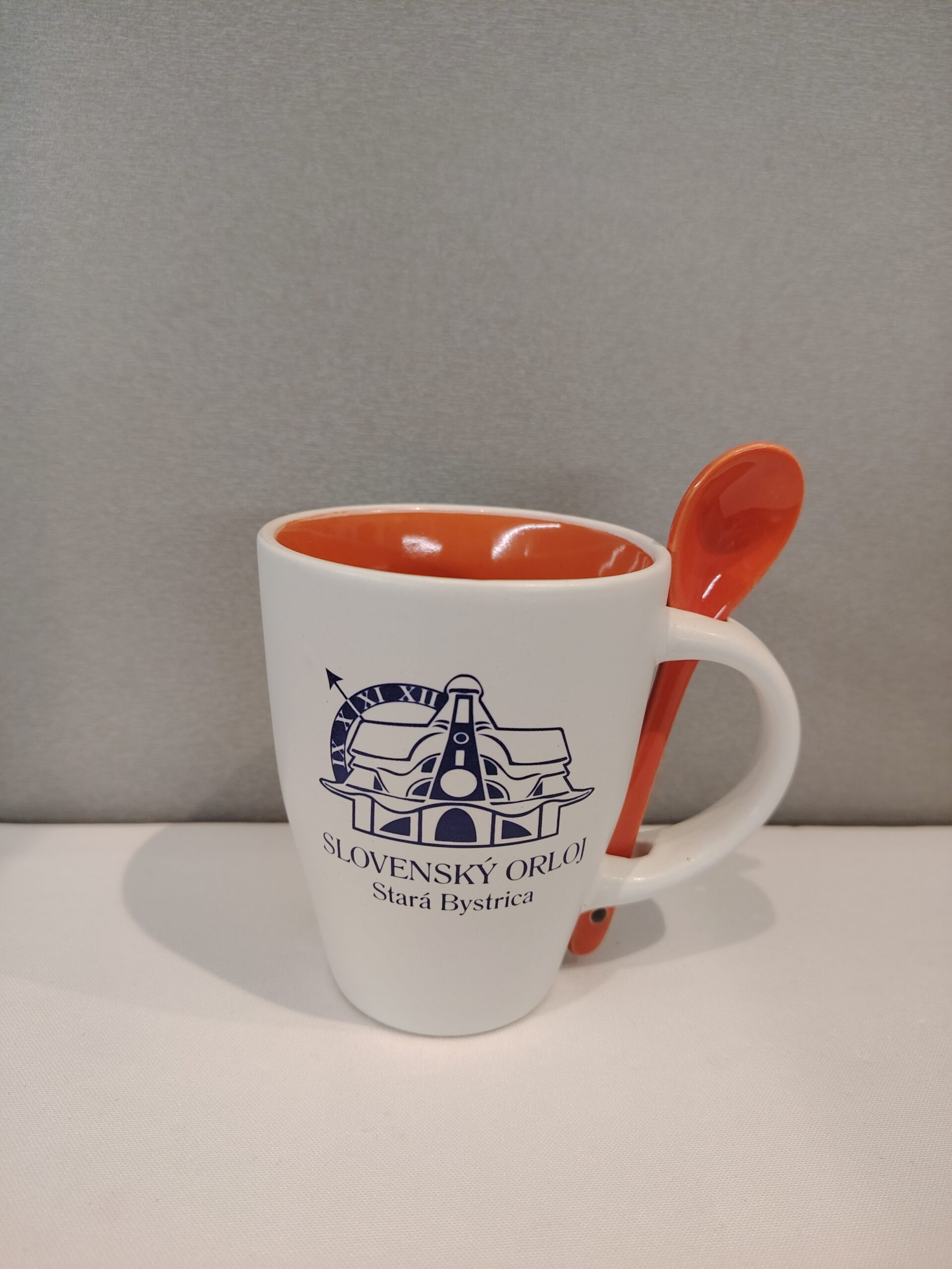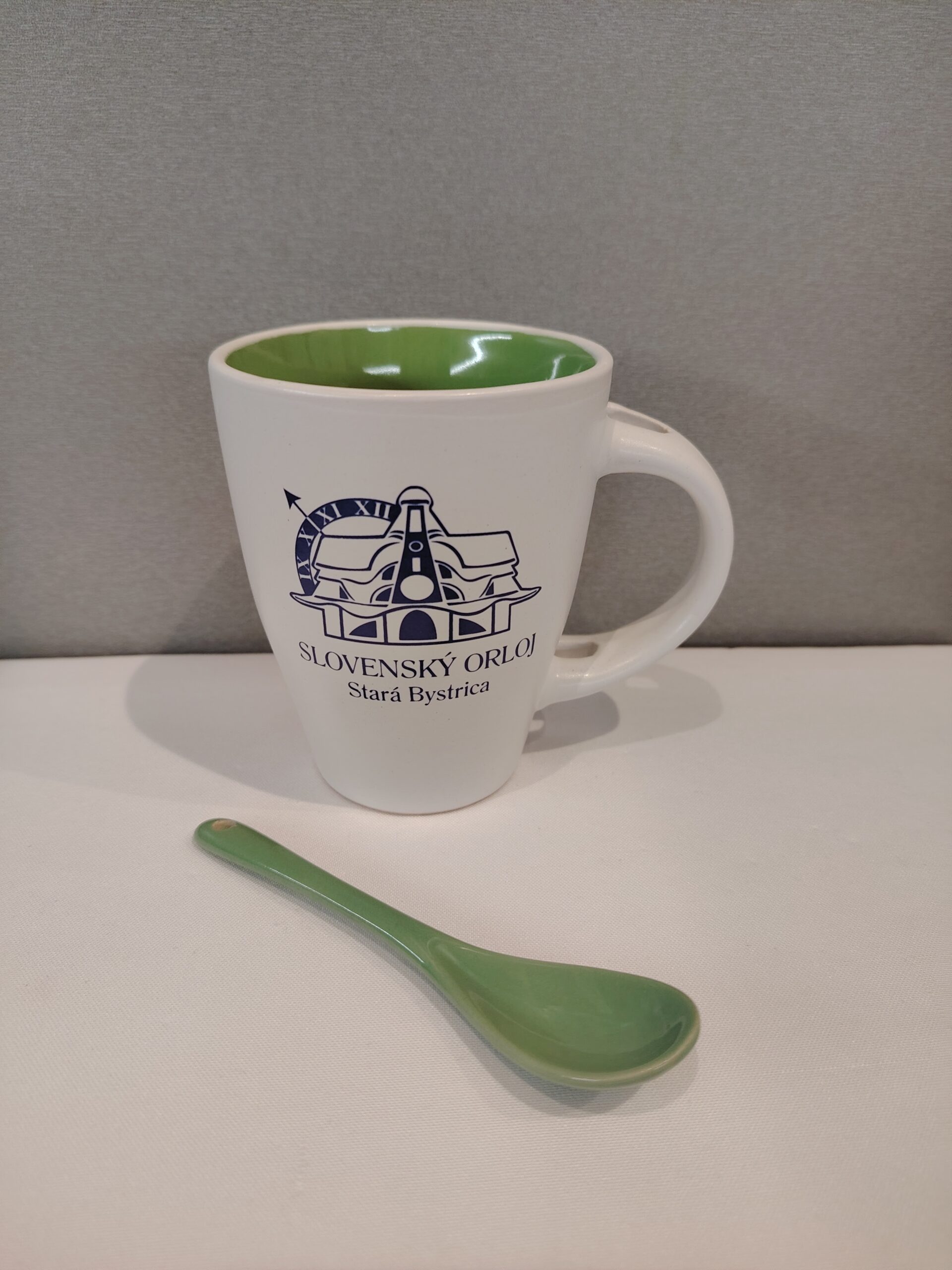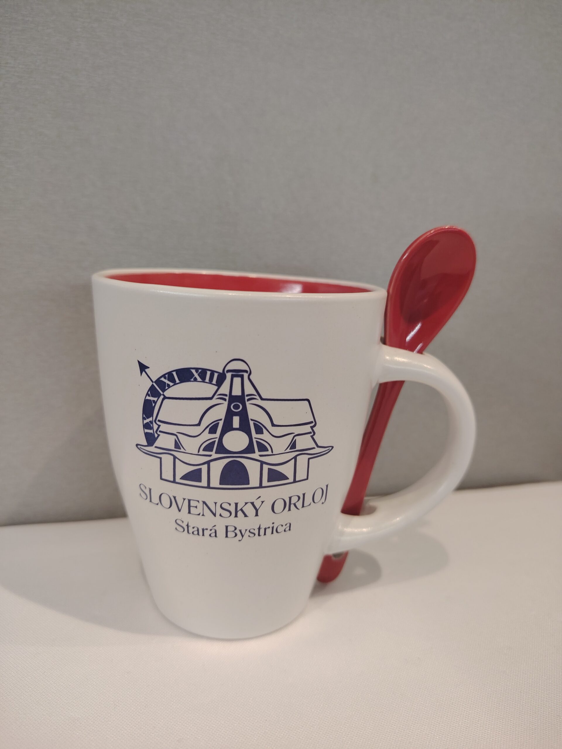 Štýlový darček vždy po ruke. Hrnček z bielej keramiky s farebným vnútrom s potlačou „Slovenský orloj, Stará Bystrica“ s farebnou lyžičkou. Odporúčame ručné umývanie, použitie v mikrovlnnej rúre je možné rovnako ako bežné keramické hrnčeky.